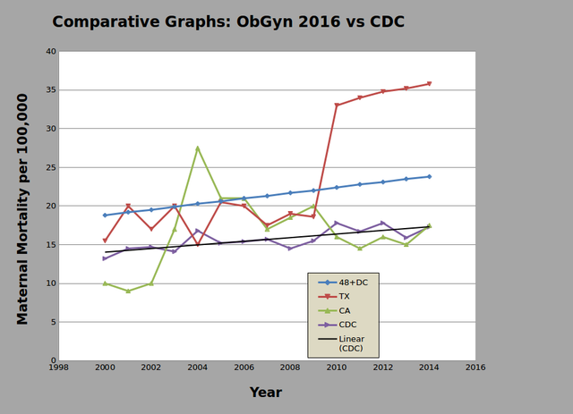 As the authors note, maternal deaths are rare events and therefore difficult to analyze state by state, except in the most populous. Reportedly there were 396 deaths in 2000, increasing to 856 deaths in 2014. They examined California separately because it chose to define maternal mortality within one year of pregnancy instead of 42 days per the WHO guidelines. Though Texas adopted revisions to their death certificate in 2006, they were analyzed separately because of a sharp rise in 2010 that saw maternal mortality double. The data for the other states and Washington DC were combined into four groups, according to when they initiated revisions to their death certificates.