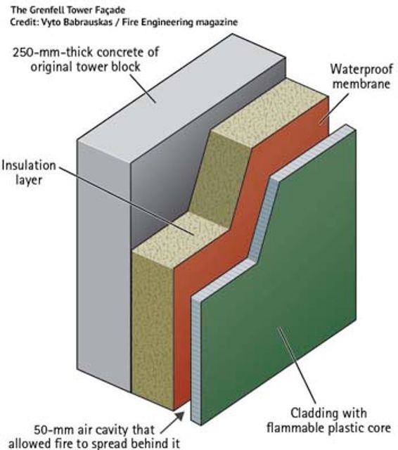 An article in Fire Engineering magazine, published for nearly 140 years to “provide training, education and management information for fire and emergency services personnel worldwide,” concludes that a major factor in the spread of the fire at Grenfell Tower was the large size of the air-gap between the external cladding and the insulation layer attached to the building façade.