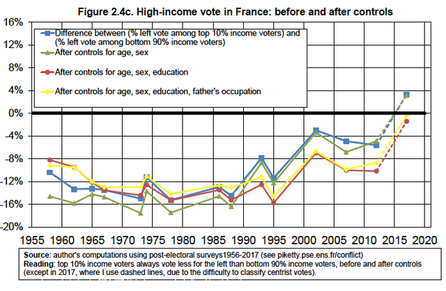 In France, a similar process is playing out. In the 2017 elections, for the first time in the history of the Fifth Republic, voters in the top 10 percent of the income distribution were more likely to support “left” parties (including the Stalinist French Communist Party, Jean-Luc Melenchon’s France Insoumise and Emmanuel Macron’s La République En Marche).
