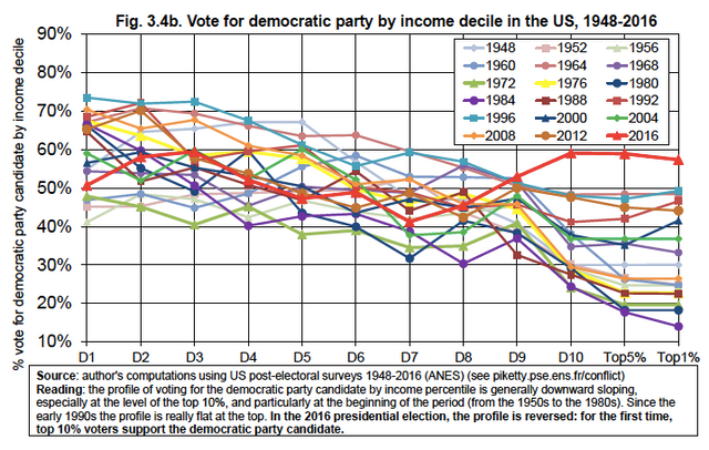 “The general conclusion is clear,” Piketty writes. “We have gradually moved from a class-based party system to what I propose to label a ‘multiple-elite’ party system. Back in the 1950s-1960s, the party system was defined along class lines: the vote for the left-wing parties was associated to both low-education and low-income voters, while the vote for right-wing parties was associated to both high-education and high-income voters.”