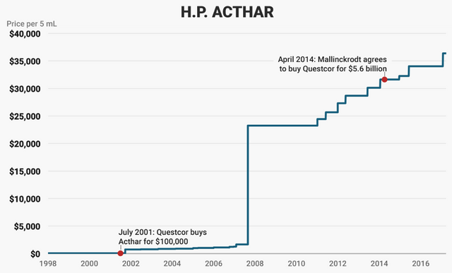 Questcor, and later Mallinckrodt, has come under intense criticism for raising the price of Acthar Gel by over 97,000 percent over the past 18 years.