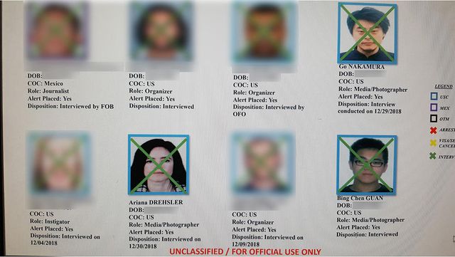 The published list contained head shots—including many gleaned from Facebook profiles—along with dossiers of the individuals, 40 of whom were US citizens. According to the NBC 7 report, “The individuals listed include ten journalists, seven of whom are US citizens, a US attorney, and 48 people from the US and other countries, labeled as organizers, instigators or their roles ‘unknown.’ The target list includes advocates from organizations like Border Angels and Pueblo Sin Fronteras.”