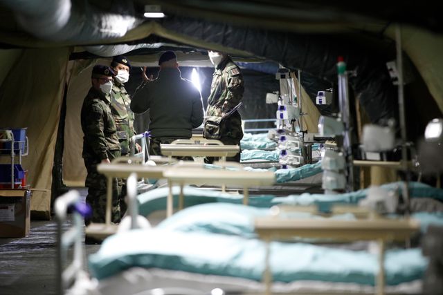 French soldiers discuss inside the military field hospital built in Mulhouse, eastern France, to treat coronavirus patients (AP Photo/Jean-Francois Badias)