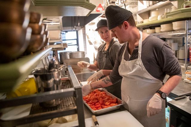 Chef Tadd Johnson of the Canary Club restaurant on the Lower East Side of New York, and his wife chef Daisy Nichols, prepare soup to be given away to member of the community, Thursday, March 19, 2020. (AP Photo/Mary Altaffer)