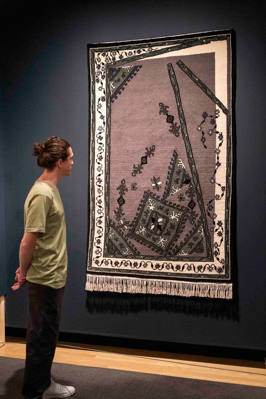 On display are several paintings by Shorsh Saleh depicting his experiences as an Iraqi refugee who spent two years “illegally” crossing borders and eight years waiting for asylum in the UK. His strikingly designed carpets, hand-woven by Kurdish women in Iraq, are also on show.