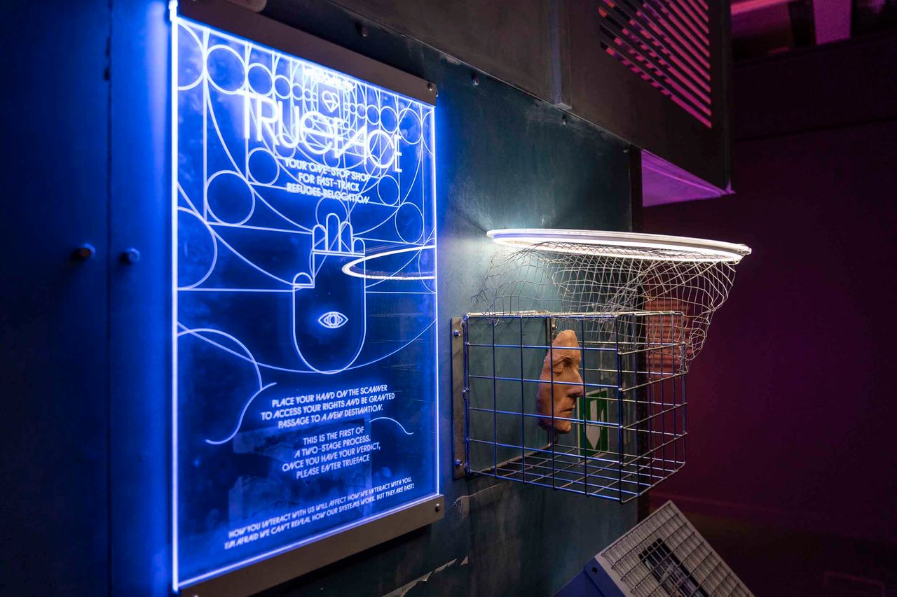The future for refugees becomes even more grisly in the “Face to Open Doors” interactive installation by the creative studio Anagram, where the visitor can experience an interrogation in an imaginary future by an artificial intelligence (AI) border guard.