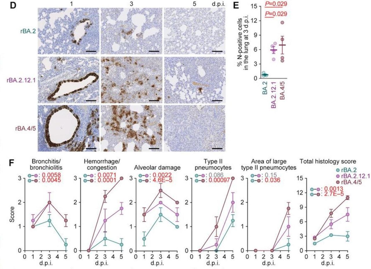 The authors wrote, “The relatively more severe disorders in the lungs of BA.4/5 infected hamsters than those of BA.2 infected hamsters were supported by the more efficient spread of BA.4/5 than BA.2 in the infected lungs. Altogether, these observations suggest BA.4/5 is more highly pathogenic than BA.2 in a hamster model.”