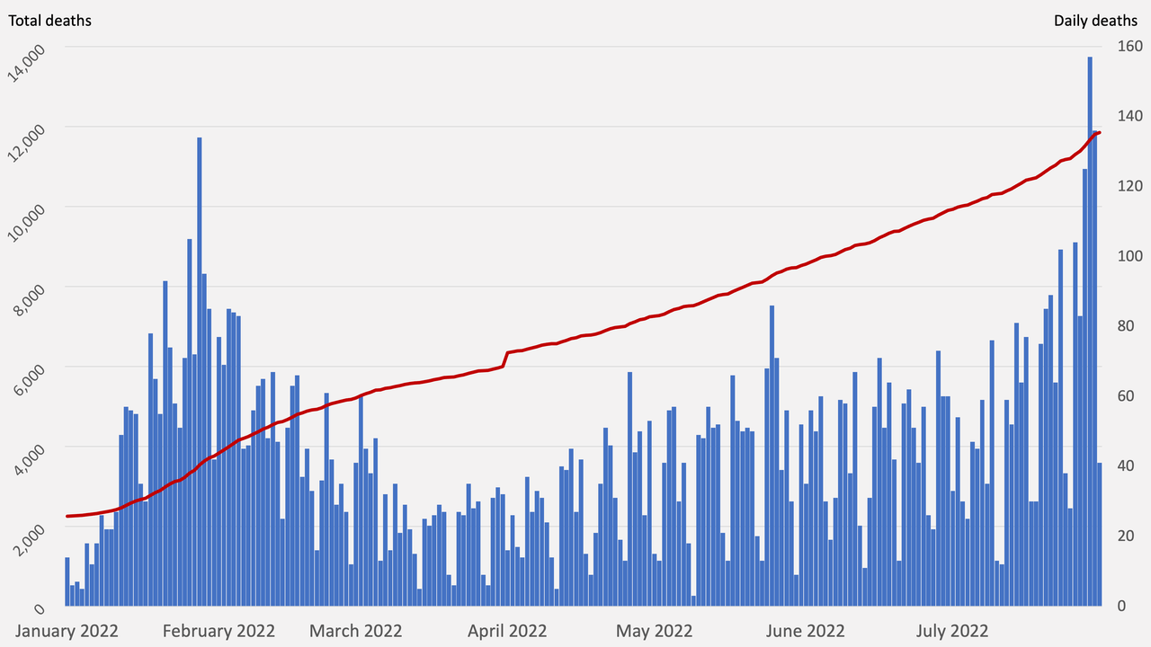 COVID-19 cases, hospitalisations and deaths continue to surge across Australia, reaching record highs over the past week. 157 deaths were reported on Friday, the highest number on any single day of the pandemic. In the week ending Sunday, 674 Australians died from the virus, an average of 96 per day, more than double the rate at the end of June.