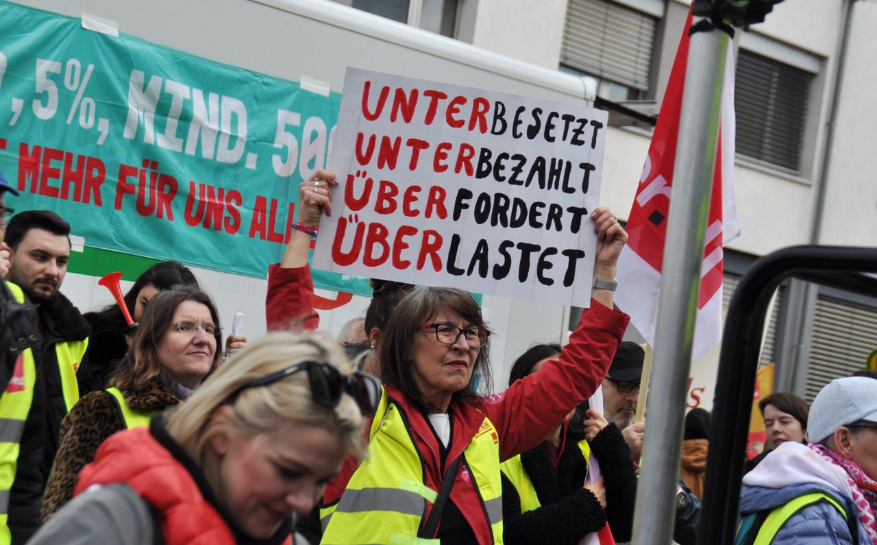 “Underpaid, understaffed, overworked, overburdened”—with this hand-made poster, a social worker from Hesse summed up the general mood of public sector workers. For a fundamental improvement in their situation, social workers, educators, municipal employees, nurses in municipal hospitals, retirement homes and providing care for the disabled, as well as refuse collectors, streetcar drivers and many others went on strike yesterday.