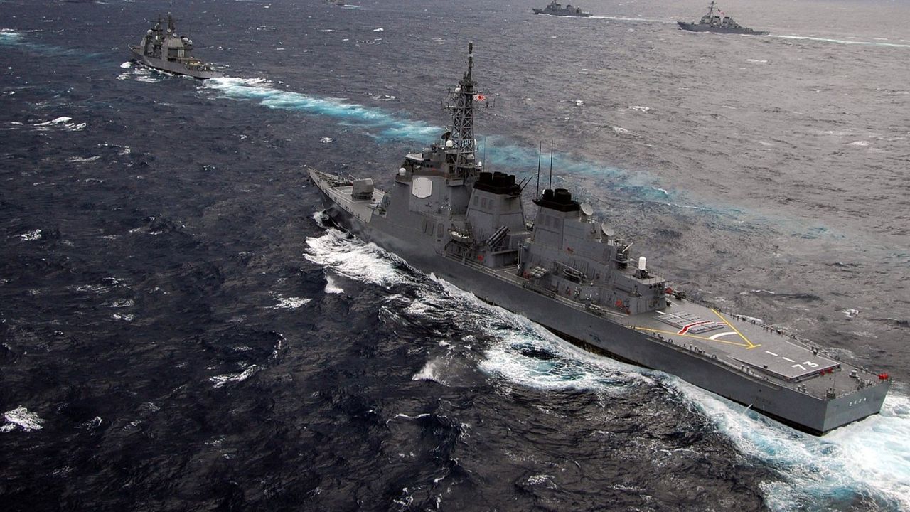 Japan Maritime Self-Defense Force (JMSDF) destroyer JDS Kongou (DDG 173) in formation with other JMSDF ships and ships assigned to the USS Kitty Hawk Carrier Strike Group in 2005. [Photo: US Navy Chief Photographer's Mate Todd Cichonowicz]