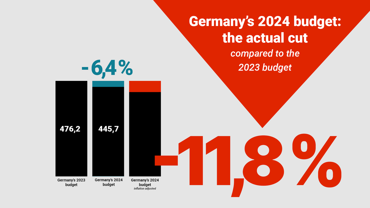 Yet the government and the opposition have not even named the true extent of the cuts. The nominal cuts of 6.4 percent or €30.5 billion, which are horrendous in themselves, do not take into account core inflation of 6.1 percent. If this is included, the overall cut in the budget is 11.8 percent.