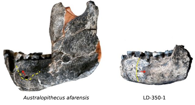 The LD-350-1 mandible, right, pictured next to an Australopithecus afarensis mandible. LD-350-1 has been provisionally attributed to the genus Homo.