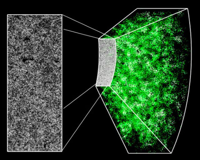 This image captures one tenth of the total sky survey. The image on the left is the view of space as seen from Earth. The wedge shows the same image as part of the map of galaxies in three dimensions. Each dot represents a galaxy containing several hundred billion stars. The brighter regions represent dense galactic clusters. Credit: Jeremy Tinker and the SDSS-III collaboration