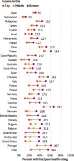 This means that there was a 25.9 percentage point difference in self-perceived health quality between those in the top and bottom income groups. The study’s authors consider anything above 10 percent as a large disparity. Only Portugal (26.7 percent) and Chile (33 percent) showed wider disparities between the rich and poor in self-perceived health.