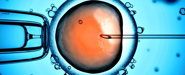 Illustration of injecting an ovum (egg) with a donor sperm and the CRISPR-Cas9 enzyme