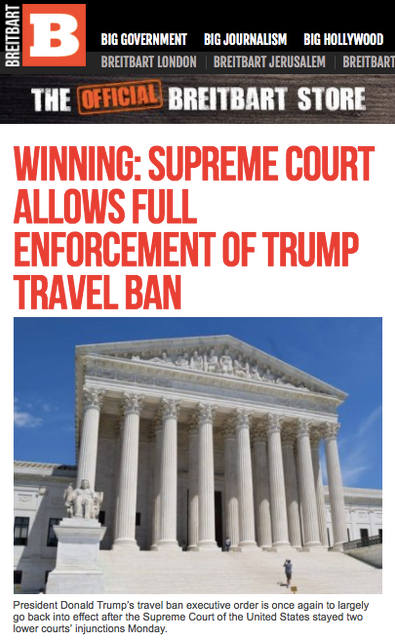 The extreme right responded with elation to yesterday’s decision. Stephen Bannon’s Breitbart Newsran the Supreme Court’s order as its main headline last night, quoting Attorney General Jefferson Sessions, who called the order a “substantial victory.”