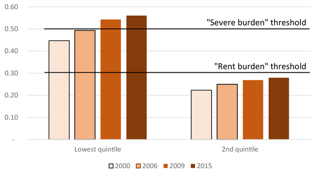 The squeeze is relentless. Families at the bottom end of the pay scale have not been able to get out of the squeeze in the business recovery after a recession. They note: “This increase in rent burdens over the past 15 years occurred through each business cycle period including both the period prior to the financial crisis (2000-2006), the economic downturn (2006-2009) and the subsequent recovery (2009-2015). Although rent-to income ratios are greatest among low-income households, the share of income spent on rent also rose among higher income renters.”