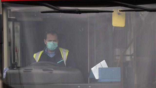 A London bus driver wears a mask to try and protect him from the coronavirus as he drives on his route in London (AP Photo/Frank Augstein)