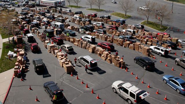 Cars line up for food at the Utah Food Bank's mobile food pantry at the Maverik Center Friday, April 24, 2020, in West Valley City, Utah. (AP Photo/Rick Bowmer)