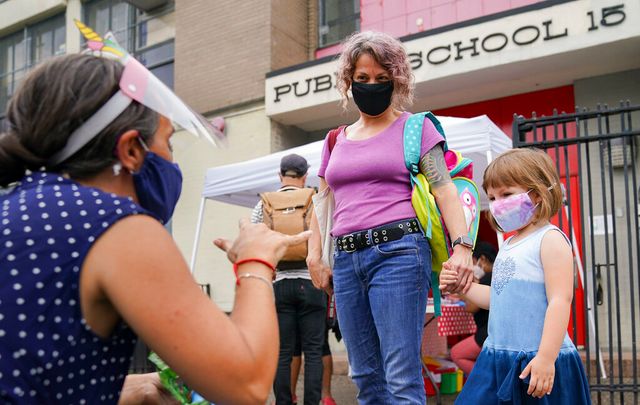 Teachers and students at P.S. 15 in Red Hook, Brooklyn, New York City on September 2, 2020. (AP Photo/John Minchillo)
