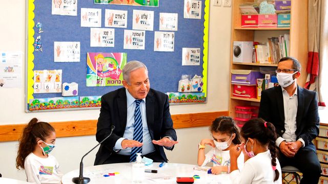 Israeli Prime Minister Benjamin Netanyahu at the Netaim School in the West Bank settlement of Mevo Horon, September 1, 2020. (Marc Israel Sellem/Pool via AP)