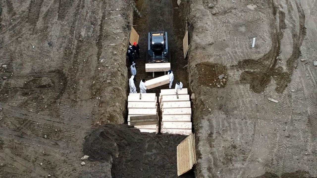 Workers burying bodies on Hart Island. Credit: John Minchillo