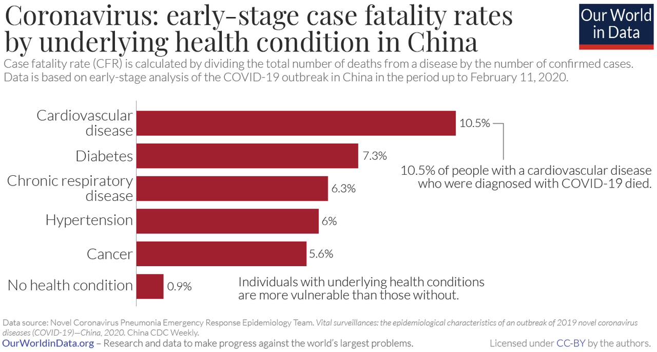 Additionally, several studies from China, Europe, and the US have investigated non-communicable illnesses such as high blood pressure, diabetes, and cardiac disease as contributing factors for developing severe or fatal COVID-19 infection. A study using data on 72,314 cases from the Chinese Center for Disease Control and Prevention published in the Journal of the American Medical Association (JAMA) on April 7 found that the overall case-fatality rate (CFR) was 2.3 percent. However, those with cardiovascular disease had a 10.5 percent mortality risk, 7.3 percent for diabetes, 6.3 percent for chronic respiratory disease, 6.0 percent for hypertension, and 5.6 percent for cancer.