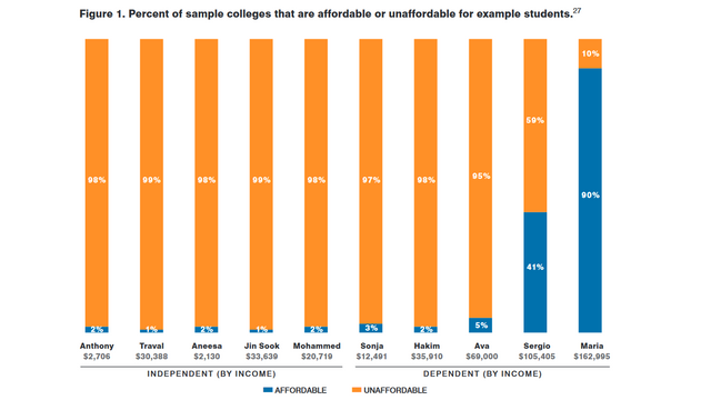 The study draws shocking results. “[A]lthough the student from the highest income quintile in these analyses could afford to attend 90 percent of colleges in the sample,” the report states, “the low- and moderate-income students with fewer financial resources could only afford 1 to 5 percent of colleges.”